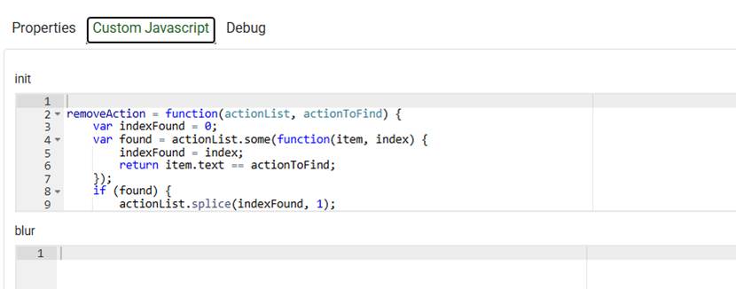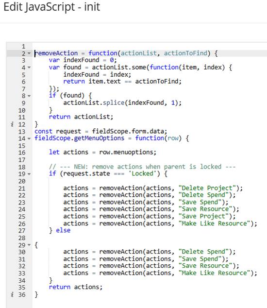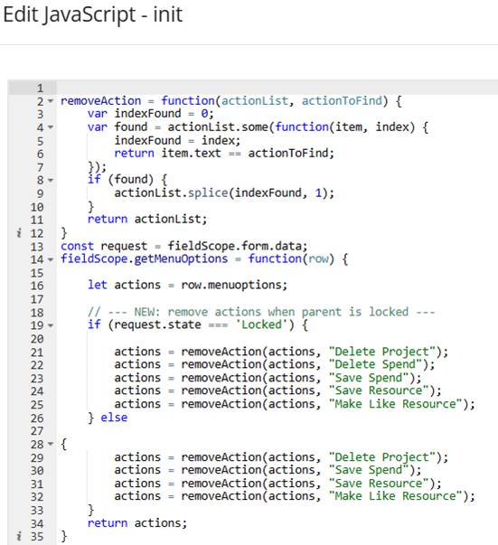 - In the init block of the Custom JavaScript, use fieldScope.getMenuOptions to access the actions to define which actions are allowed and under what conditions.