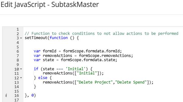 - Similar to the previous example, all actions are disabled when fieldScope.form.data.state === 'Locked', and of the 5 actions available in workflow for subtasks only "Delete Spend" is allowed.